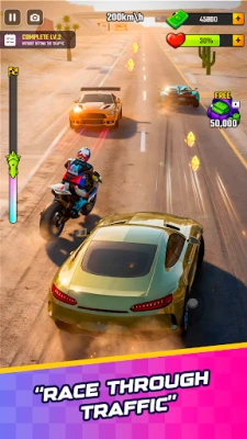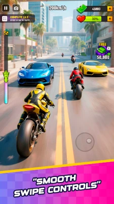 Shiga duniyar gudu mai matukar zafi da adrenaline tare da **Rush Bike 3D: Bike Racing Game**! Ka ji dadin guje-guje mai hadari a cikin zirga-zirgar ababen hawa na babbar hanya, inda kowane kuskure zai iya kai ka ga hatsari. Nunawa kwarewarka ta hanyar wuce motoci a minti na karshe, yana gwada saurin tunaninka a cikin yanayin da aka cika da cunkoso. Sarrafa baburka yana da sauki kuma yana da inganci; kawai ka shafa hagu ko dama don canza hanya ba tare da dauke yatsanka ba, yana ba ka damar sarrafawa cikakke da jin dadi na gaskiya yayin gudu mai yawa.