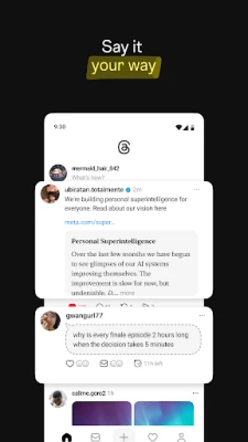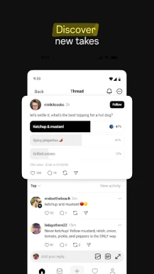 Threads wuri ne na musamman da al'ummomi ke haɗuwa don tattauna komai, daga batutuwan da ke faruwa yanzu zuwa waɗanda za su yi tasiri nan gaba. Ko menene sha'awarka, Threads yana ba ka damar bin diddigi da haɗa kai tsaye da masu kirkire-kirkire da kake so da kuma sauran mutanen da ke son abubuwa iri ɗaya. Haka kuma, za ka iya gina tushe mai biyayya naka don raba ra'ayoyinka, tunaninka, da kuma kirkire-kirkirenka ga duniya. Wannan dandalin yana ba ka damar faɗar abin da ke cikin zuciyarka da kuma sarrafa waɗanda za su iya shiga tattaunawarka.
